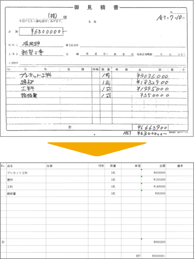 現場で作成・スキャンされた手書きのPDF見積書も、AIが文字を認識してExcelに出力します。